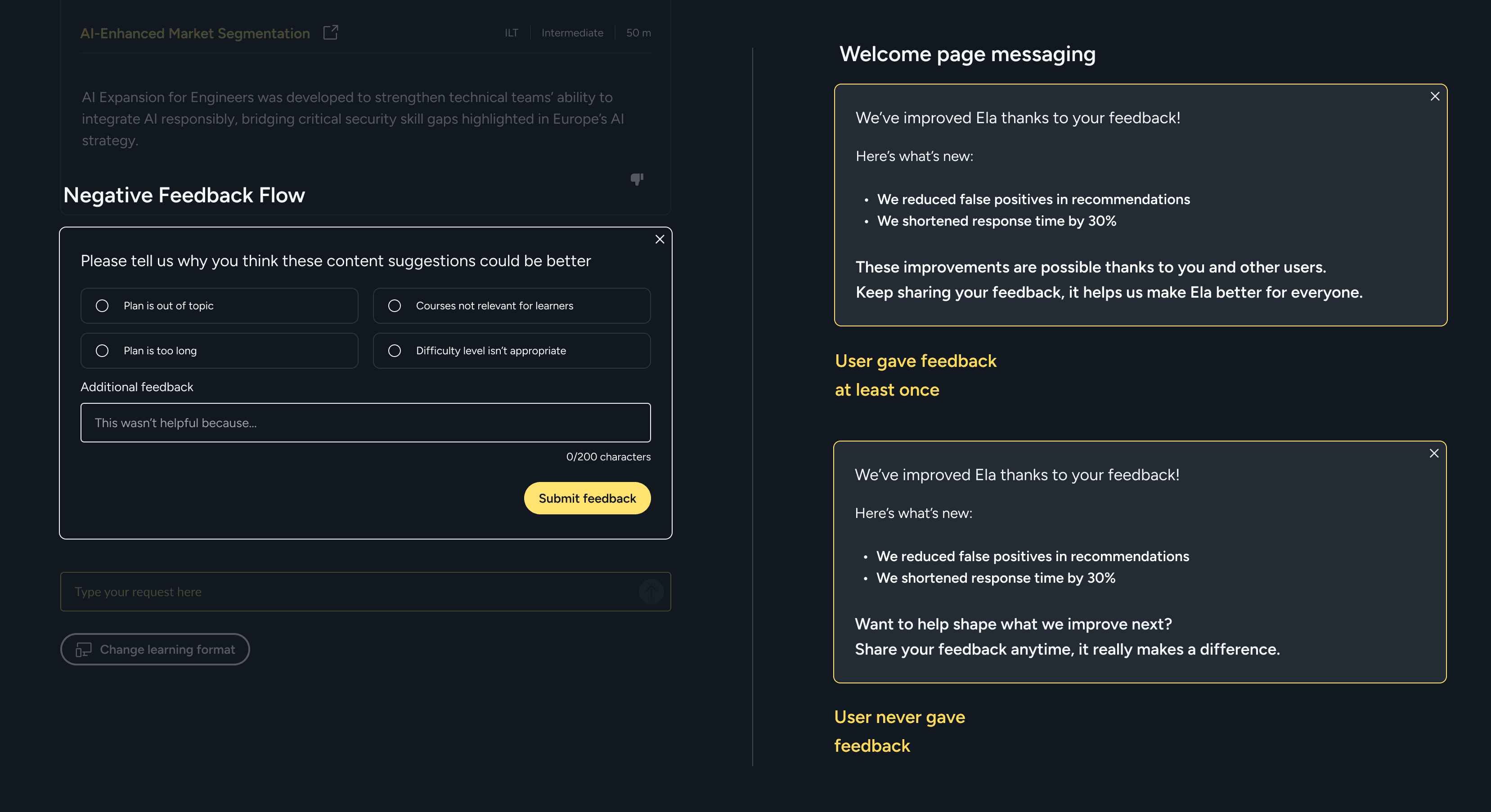 We also experimented with a lightweight feedback loop. After each recommendation, reps could rate its usefulness or flag concerns, but adoption was low. To encourage participation, I designed a motivational nudge that showed how their input would improve Ela’s accuracy over time. The next iteration will introduce a percentage-based improvement signal to make that impact more tangible. While still early, this lays the foundation for long-term motivation through visible progress.